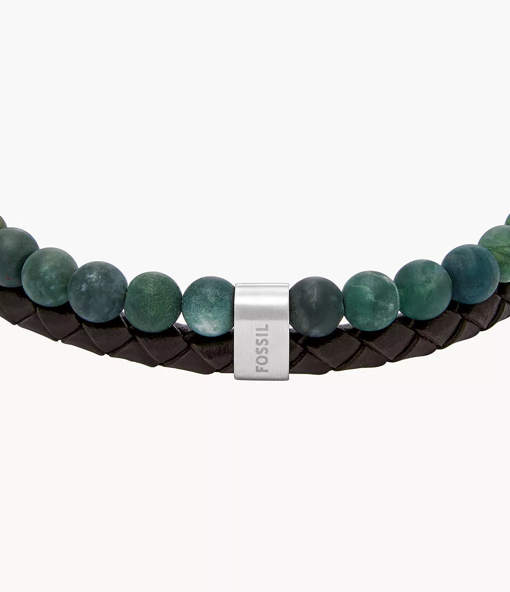 Découvrez notre bracelet multirang audacieux, alliance du cuir marron et des perles de verre vertes. À la fois masculin et moderne, ce modèle à superpositions présente d’élégantes perles argentées juxtaposées à du cuir marron de qualité. Le fermoir à boucle déployante apporte une touche robuste et pratique. Portez ce modèle seul ou avec d’autres bracelets pour un style tendance.
