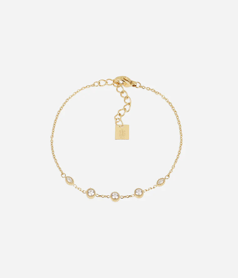 Bracelet en acier doré à l'or fin par ionisation, sur lequel sont sertis des zirconiums ronds.