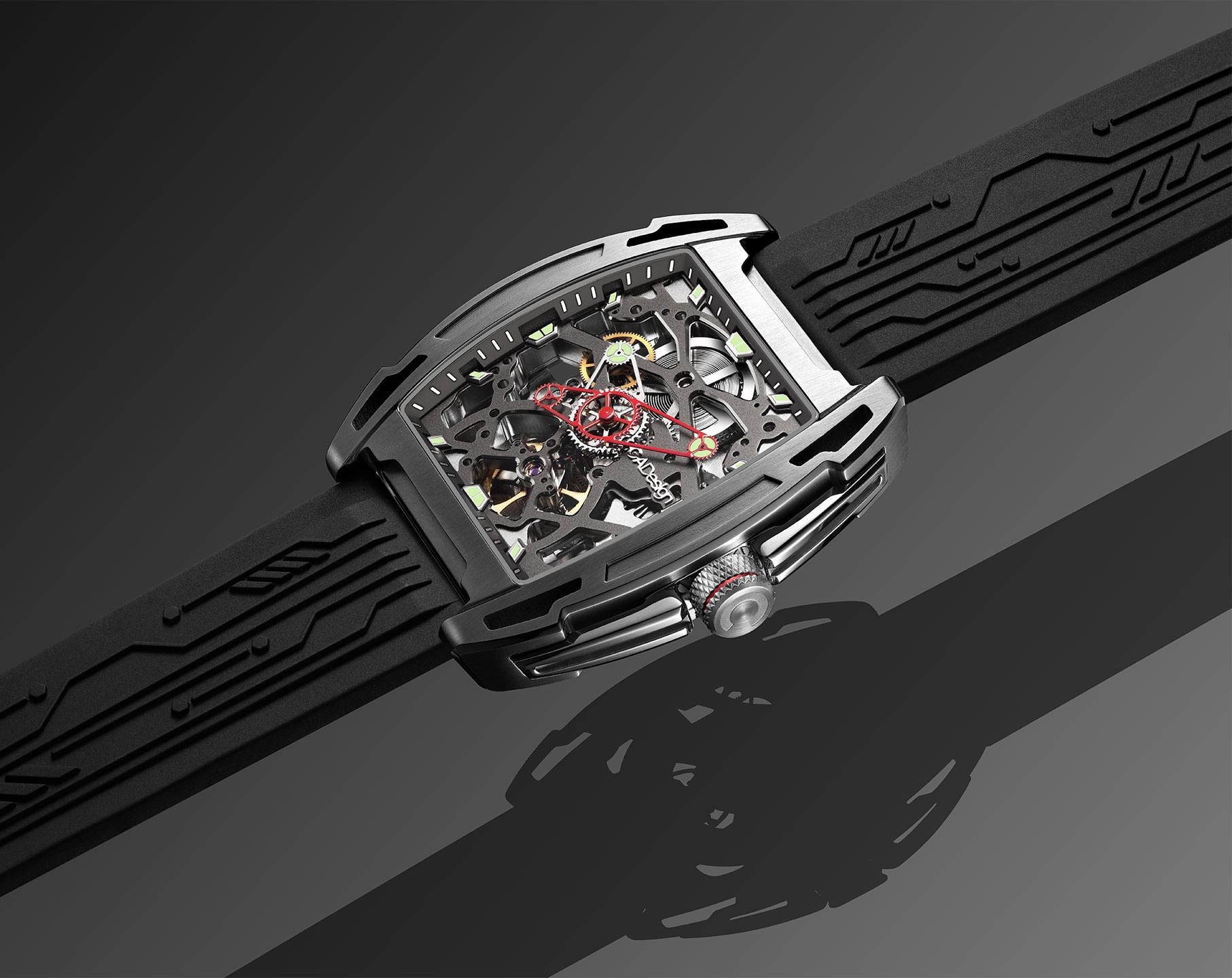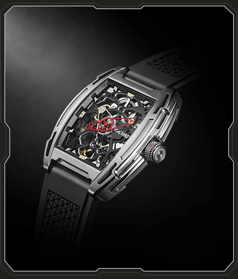 la protection et la présence, tandis que le design squeletté révèle le rythme intérieur du mouvement. Les index en Super-LumiNova C3 suisse brillent comme des phares dans la nuit, guidant celui ou celle qui le porte vers des futurs encore à écrire. Un bracelet à motif de circuit complète cette invitation à explorer les possibilités du temps.