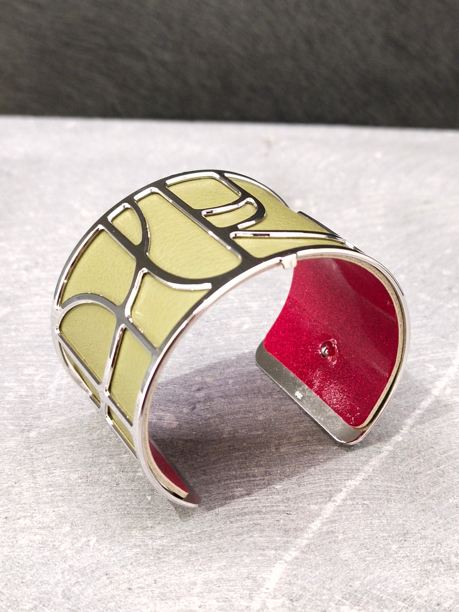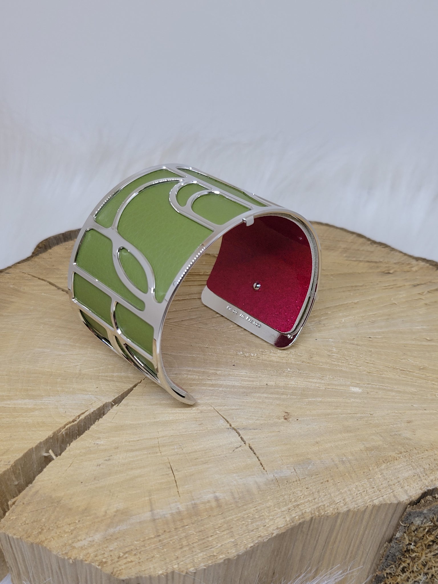 Les Georgettes Manchette Volute argenté 40mm + cuir chlorophylle/rose pailleté vernis