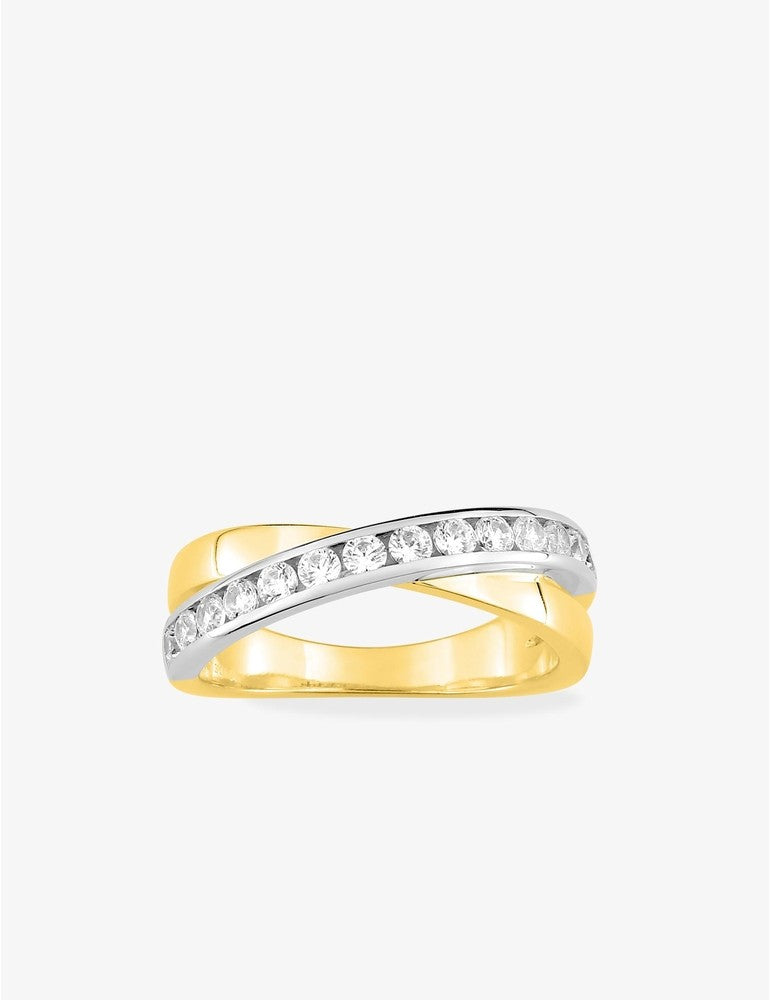 Cette bague en plaqué or possède un anneau qui s'entremêle avec un autre anneau serti d'oxydes de zirconium sur du rhodium. Les pierres ont un diamètre de 2 mm et possèdent un serti rail.