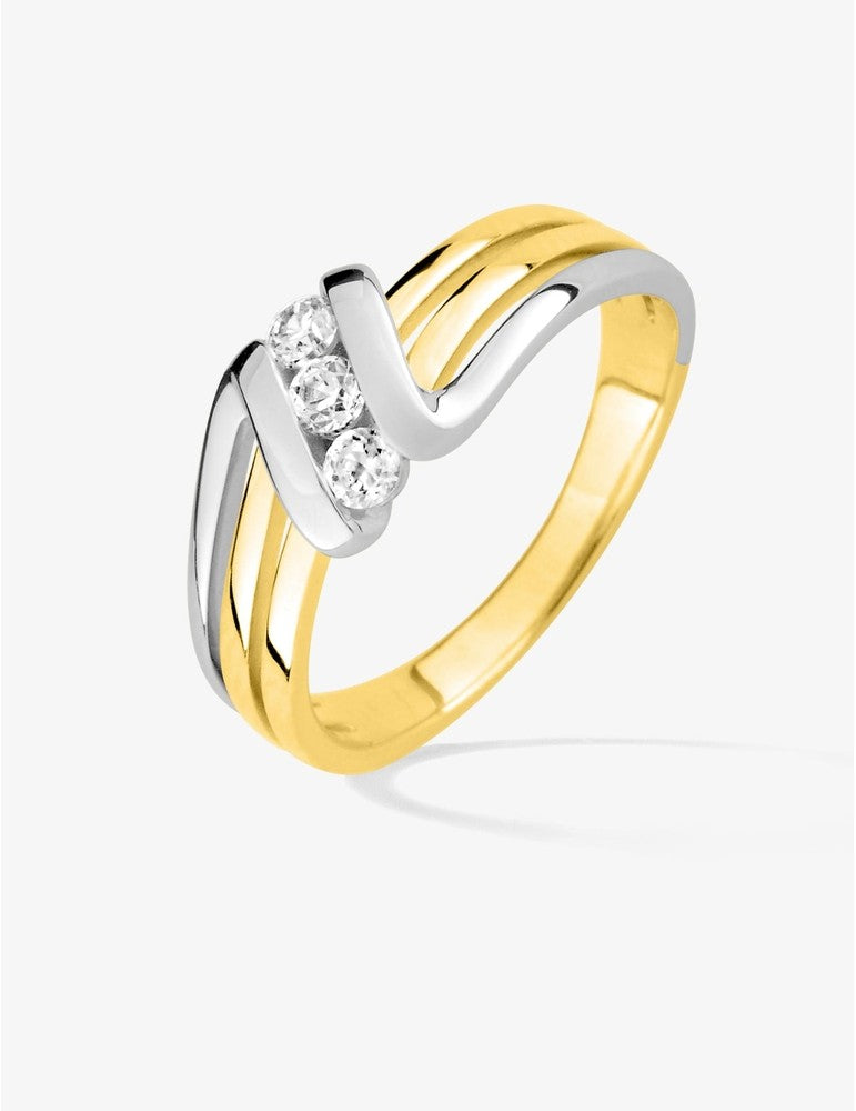 Cette bague est composée de deux anneaux en plaqué or entrelacés par un anneau en rhodium pour laisser place à une trilogie d'oxydes de zirconium de 2 mm de diamètre. Ce bijou apportera à la fois élégance et originalité.