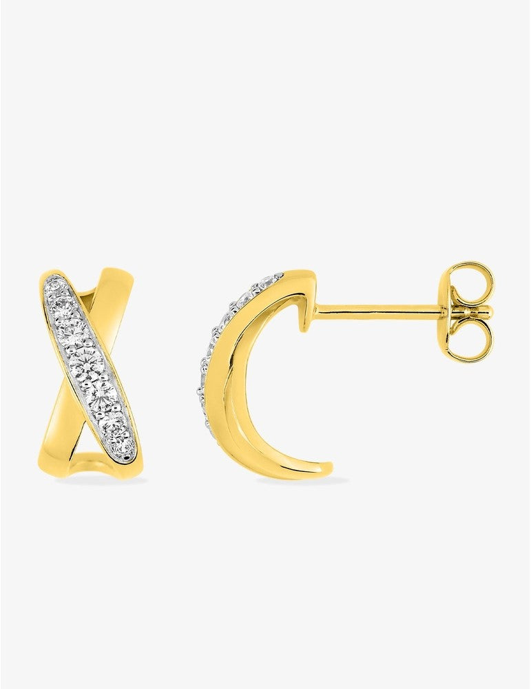 Ces boucles d'oreilles en forme de demi-créoles aux deux anneaux de 2 mm de largeur croisés apporteront une petite touche de lumière à vos oreilles. Elles sont faites de plaqué or et d'un pavage d'oxydes de zirconium sur du rhodium.