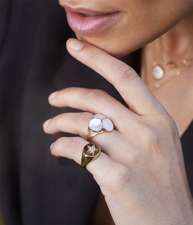 Bague en acier uni ou doré à l’or fin par ionisation sertie de 3 ronds en nacre.