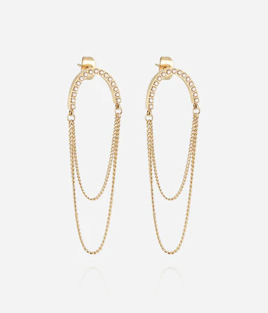 Boucles d'oreilles en acier uni ou doré à l'or fin par ionisation composées d'une tige courbée et sertie de zirconiums et de deux chainettes de part et d'autre de la tige.