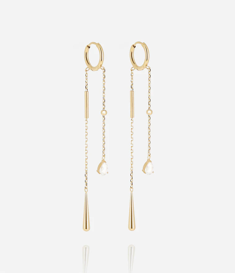 Boucles d'oreilles créoles en acier uni ou doré à l'or fin par ionisation. Ces boucles sont composées d'une créole à laquelle sont reliées deux chainettes dont une est serti d'un zirconium en forme de goutte et l'autre d'une goutte en acier.