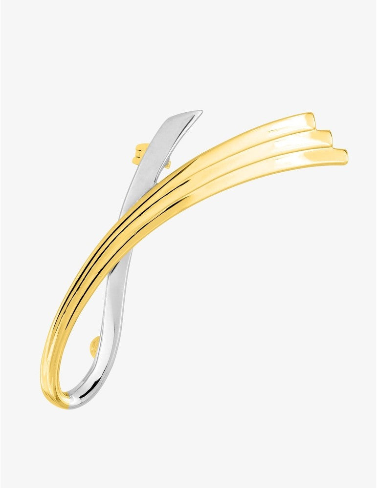 Broche en plaqué or et rhodium avec une jolie courbe qui se croise. Elle mesure 5,3 cm.